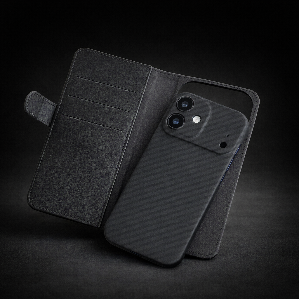 Uppgradera din mobil med ett exklusivt lånboksfodral som kombinerar äkta premiumläder, RFID-skydd, strålningsreducering på 70–90 %, samt ett avtagbart Kevlar™-skal för extremt starkt och ultralätt skydd.
